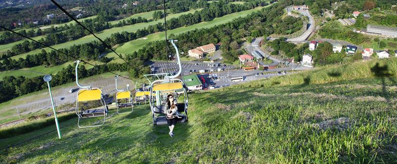 大室山位於靜岡縣伊東市,是一座海拔580公尺的獨立山峰。山體形狀獨特,看起來像是一個倒扣著的大碗,是伊豆高原的象徵。大室山是國家指定的天然紀念物,也是伊豆東部火山群中最大的火山渣錐。坐在往山頂的吊椅上搖曳著,約6分鐘抵達。環繞火山口遺跡一周的「火山口巡禮」是一條約1公里的步道,能以360度大全景眺望富士山、南阿爾卑斯山、伊豆七島及房總半島。